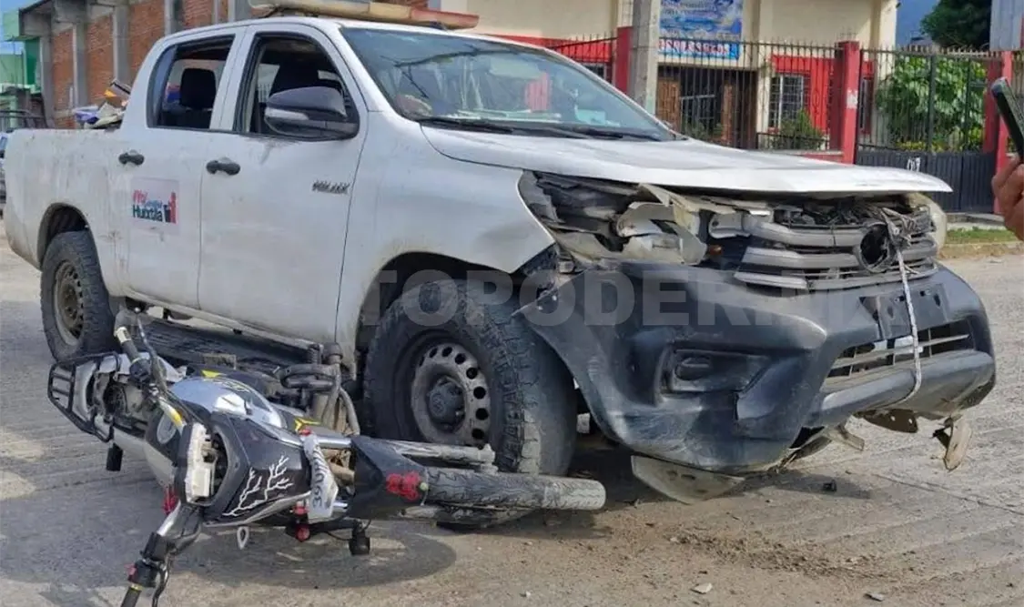 Con diversas lesiones y fracturas resultó un joven motociclista al ser impactado por un vehículo propiedad del Ayuntamiento municipal, el cual era conducido presuntamente por un familiar del alcalde Régulo Palomeque Sánchez, mismo que se dio a la fuga a pesar de la presencia de policías.