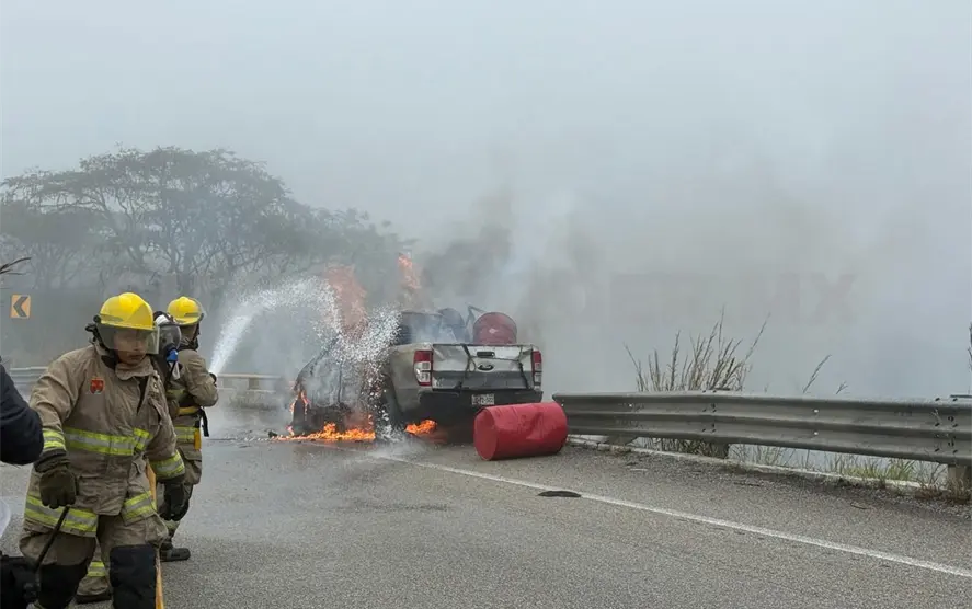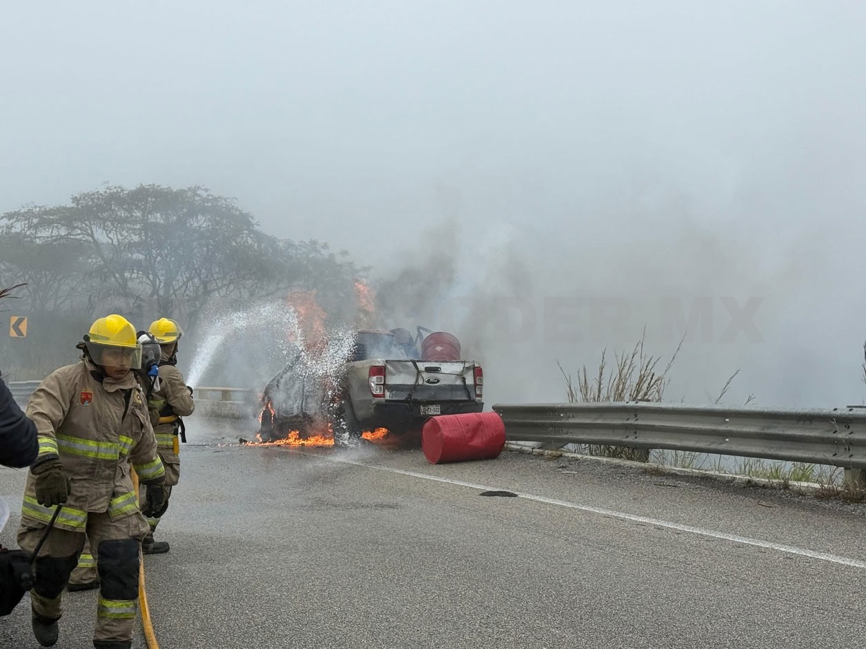 Envuelta en llamas fue como terminó una pick up luego de una presunta falla eléctrica sobre la autopista Ocozocoautla-Las Choapas, con dirección a Tuxtla Gutiérrez, a la altura del kilómetro 197+500, lo que generó que los “tragahumo” se presentaran con rapidez.