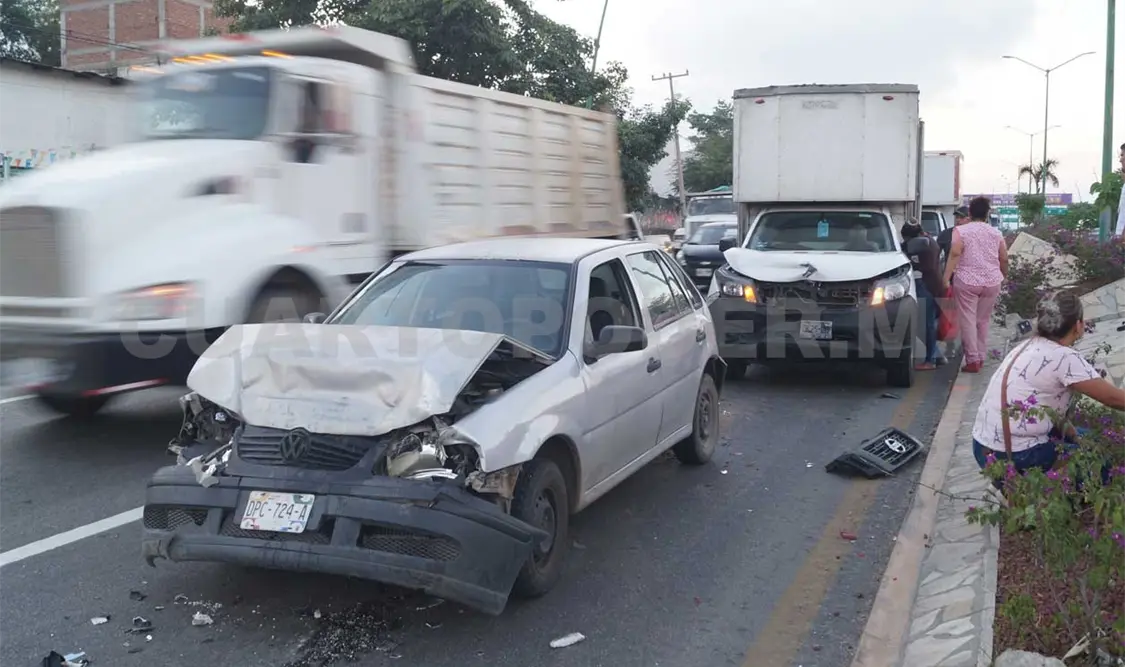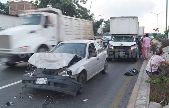 La falta de precaución provocó que el conductor de una camioneta marca Nissan tipo NP300, color blanco, con engomado local, impactara por alcance a una unidad de la marca Volkswagen tipo Pointer, color gris, con placas de circulación del estado, quien a su vez colisionó contra el automóvil marca Hyundai tipo i10, color azul, láminas DST-573-A; derivado del choque la conductora del auto resultó lesionada.