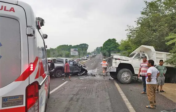Milagrosamente salvó la viva una mujer que conducía una camioneta sobre la carretera Costera, al impactarse de frente contra un camión de volteo. Esta fue llevada de emergencia a un hospital.