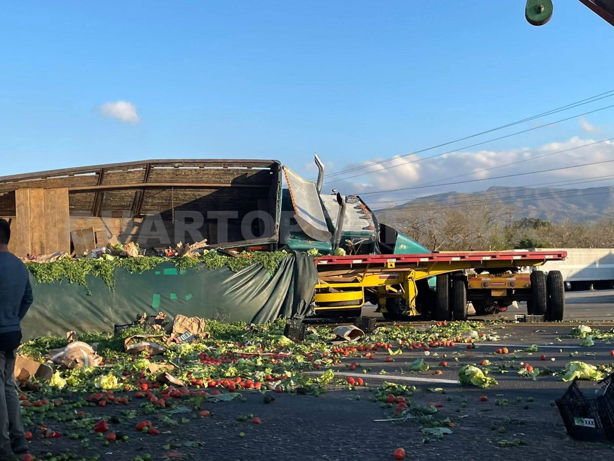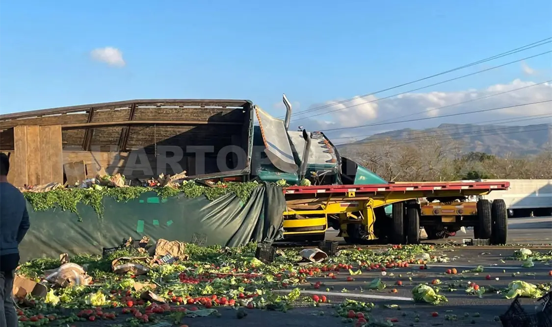 De acuerdo con los primeros reportes, un tráiler de doble remolque intentaba incorporarse a la vía principal cuando otro —cargado con verduras— no logró frenar a tiempo y se impactaron, provocando que este último terminara volcado sobre el camino.