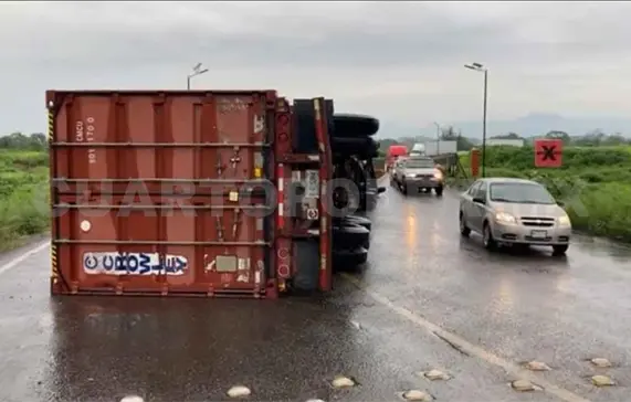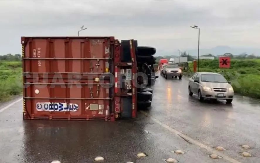 Daños materiales por varios miles de pesos fue lo que dejó como saldo la volcadura de un tráiler sobre el libramiento Sur de Tapachula, en una curva del puente provisional sobre el río Coatán.
