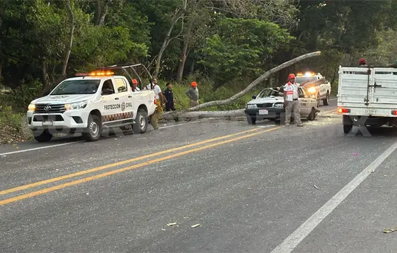 Se dijo que un árbol cayó sobre la carretera al momento en que iba pasando un vehículo particular Nissan Tsuru y atrás de este un taxi cuyo conductor no pudo frenar, registrándose el fuerte choque. El transporte público acabó totalmente destrozado fuera del camino.