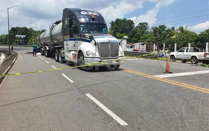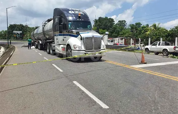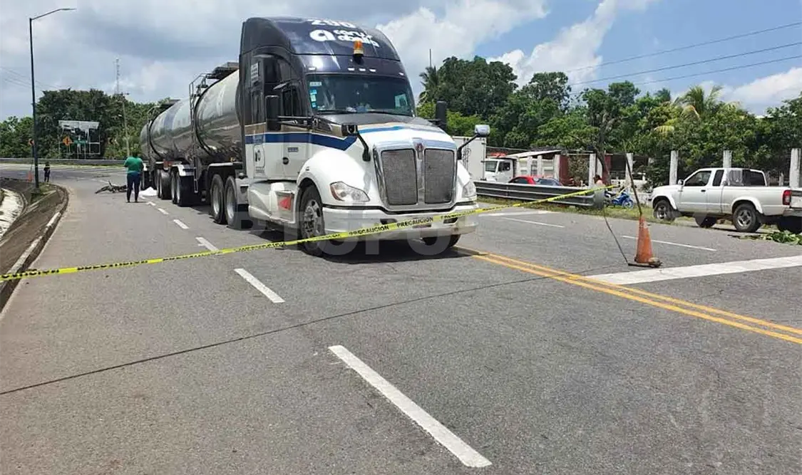 En una curva el conductor del tráiler color blanco con franjas azules y que jalaba dos cisternas con 24 mil litros de aceite, rebasó a la persona que manejaba una bicicleta, pero las llantas traseras le pasaron encima, quedando sin vida sobre la carpeta asfáltica.