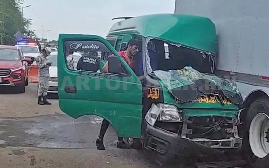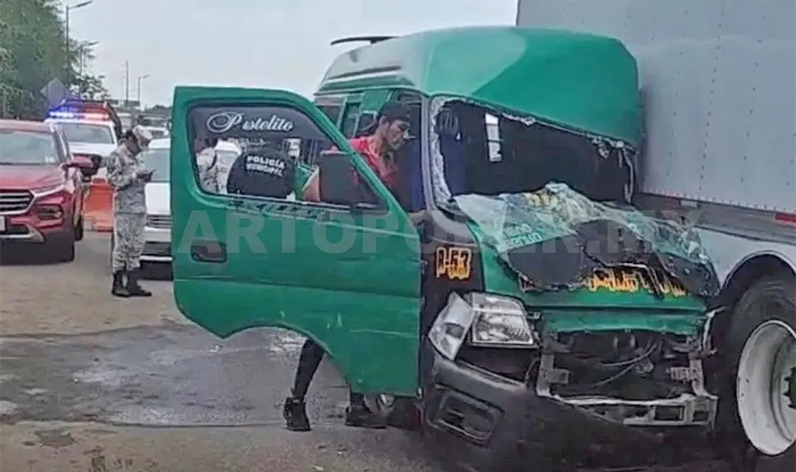 La unidad color verde de transporte público de la ruta Viva México-libramiento Derecha se desplazaba en la carretera Costera, pero a la altura de la garita en donde permanecen decenas de migrantes se estrelló contra un camión de mudanza con placas 87-AZ-9W de la Ciudad de México.