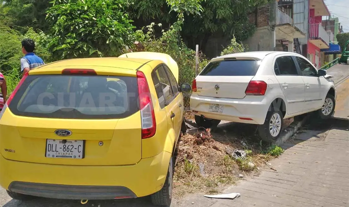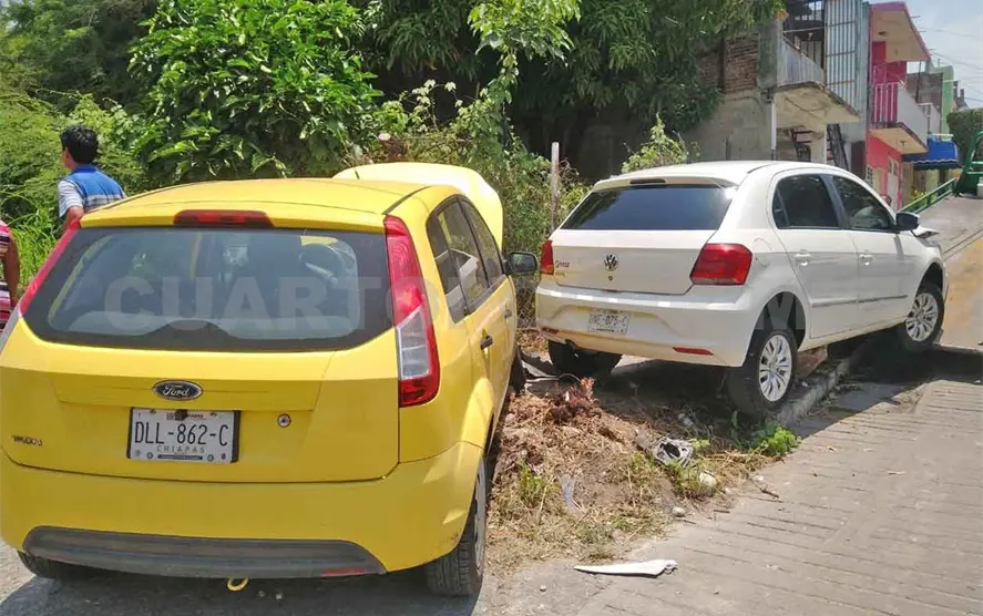 El automóvil compacto se pasó la preferencia y se estrelló contra un vehículo marca Ford tipo Ikon, modelo 2014, color amarillo, láminas de circulación DLL862C del estado de Chiapas, manejado por Brenda Guadalupe Santos Guizar.
