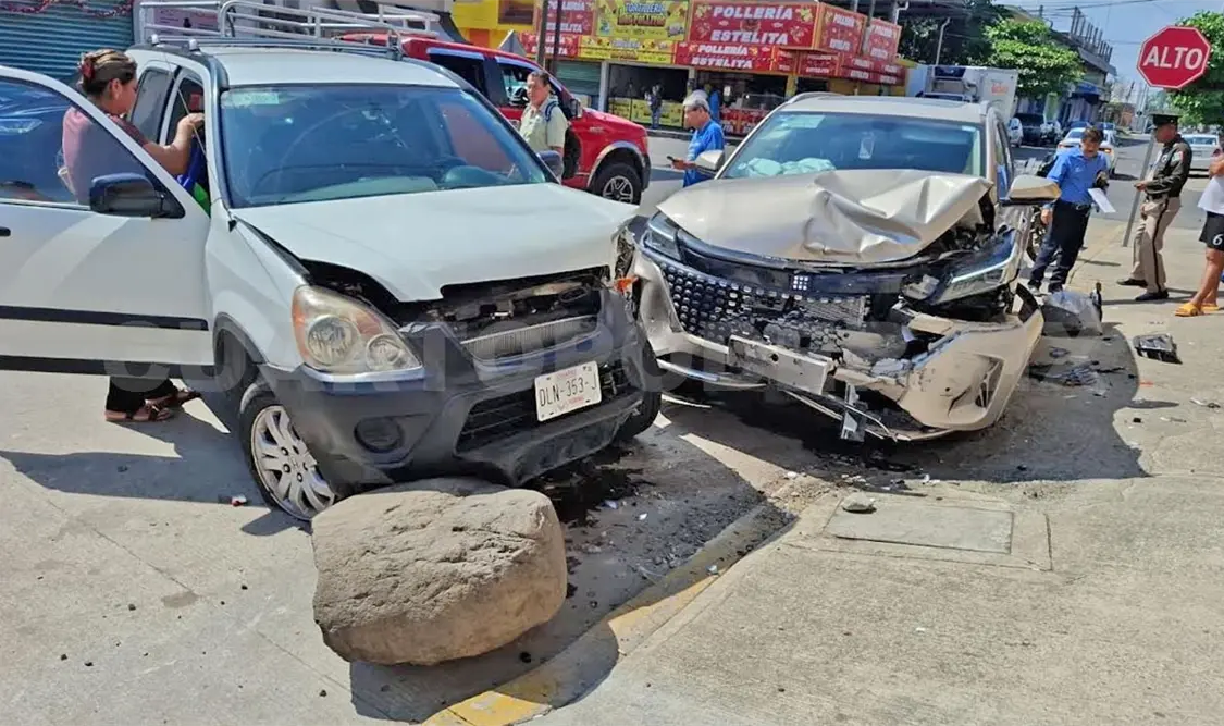 Daños materiales por varios miles de pesos dejó un fuerte choque en el que se vieron involucradas dos camionetas, en el cruce de la 13ª. avenida Sur y 20ª. calle Oriente, en la colonia 16 de Septiembre, al sur-oriente de Tapachula.