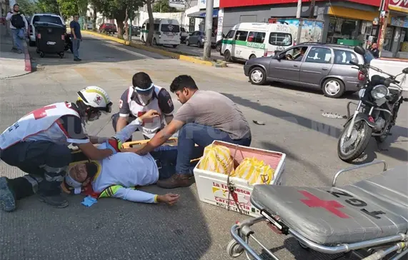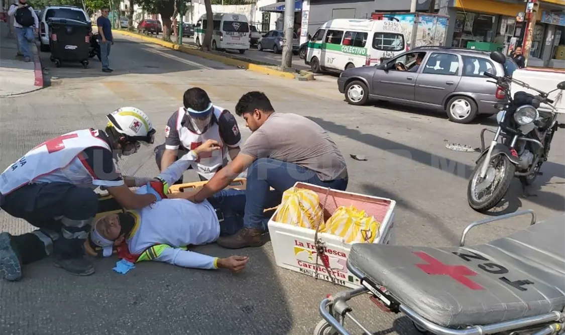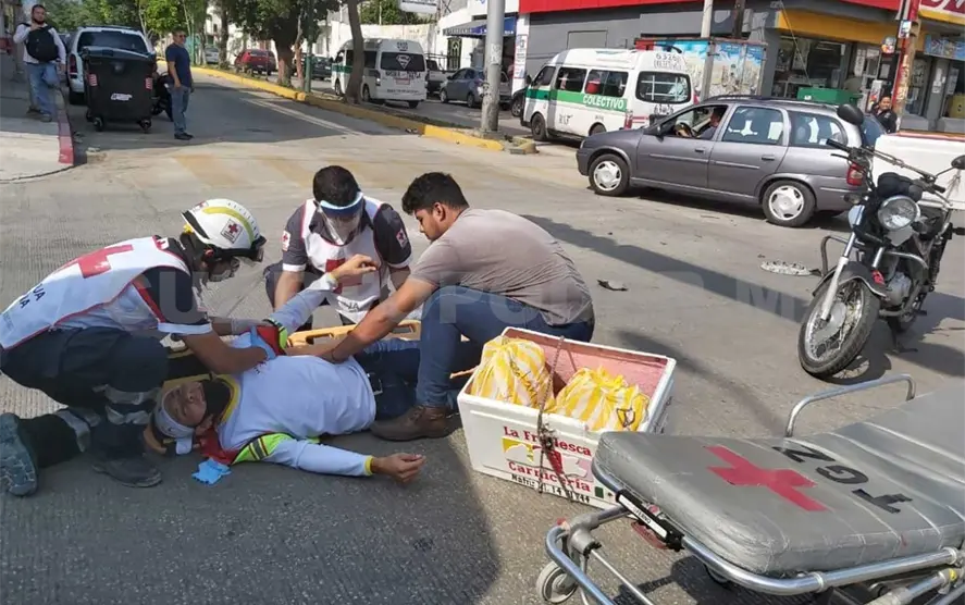 Con una fractura en la pierna y múltiples golpes, además de excoriaciones, quedó un motociclista luego de ser impactado por un vehículo en la avenida Central y 13 Oriente del barrio Tzocotumbak en la capital del estado.