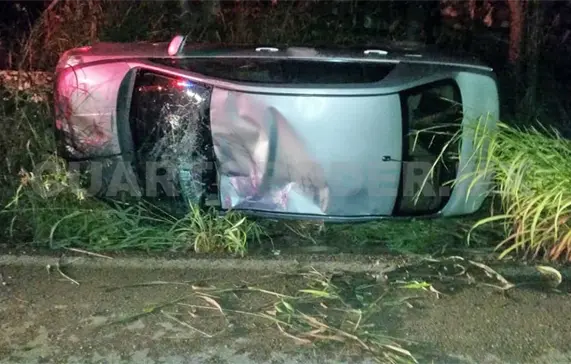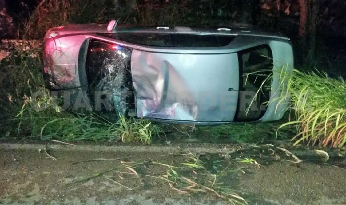 El exceso de velocidad provocó que el conductor de un vehículo marca Nissan tipo Tiida color gris perdiera el control de la unidad al llegar a la curva, terminando con los neumáticos al aire, sin embargo, tras el aparatoso percance, el conductor abandonó la unidad en el lugar, dándose a la fuga con rumbo desconocido.