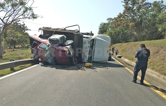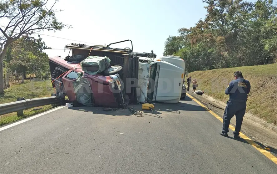 Un taxi del municipio de Escuintla, Volkswagen Jetta, conducido por Henry “N”, que circulaba en la misma dirección cerca de la unidad de carga, ante el percance ya no pudo detener su marcha y acabó impactándose contra el volteo.