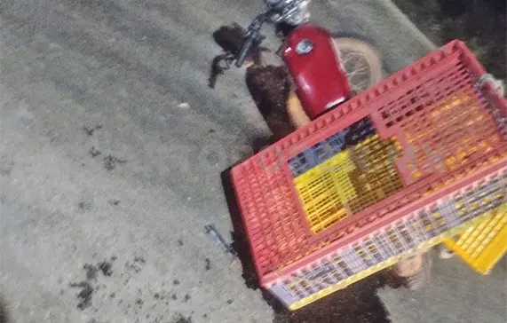Ahí, un motociclista se desplazaba con una reja cargada de pollos que llevaba para entregar, pero debido a que había gravilla suelta su motocicleta derrapó. Rodó varios metros, saliendo las aves de la reja.
