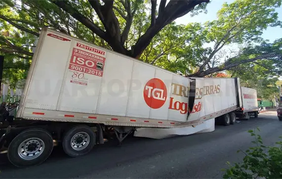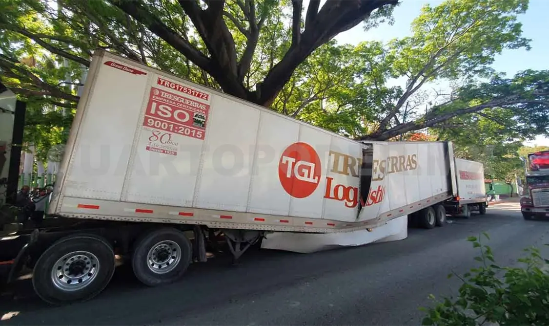 Al incorporarse a la orilla de la vía la caja se atoró con el tronco o rama de un frondoso árbol; presuntamente el chofer quiso salir del problema acelerando más, pero hizo que el daño fuera aún más grave y la unidad acabara atorada.