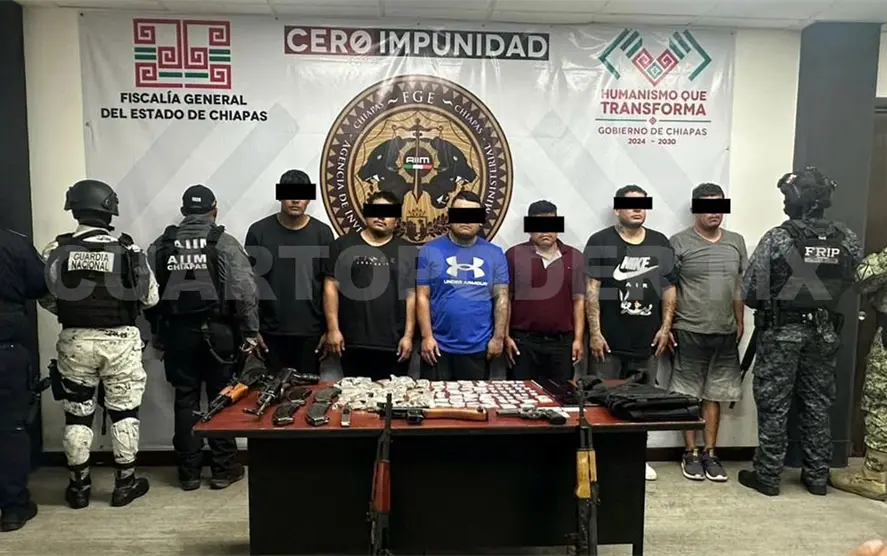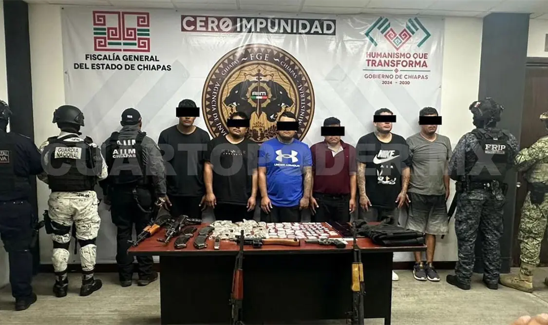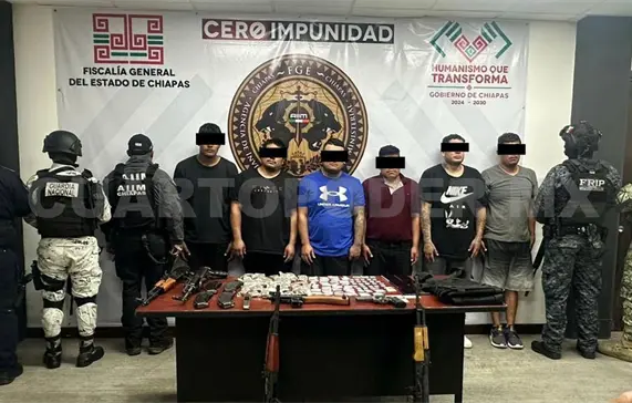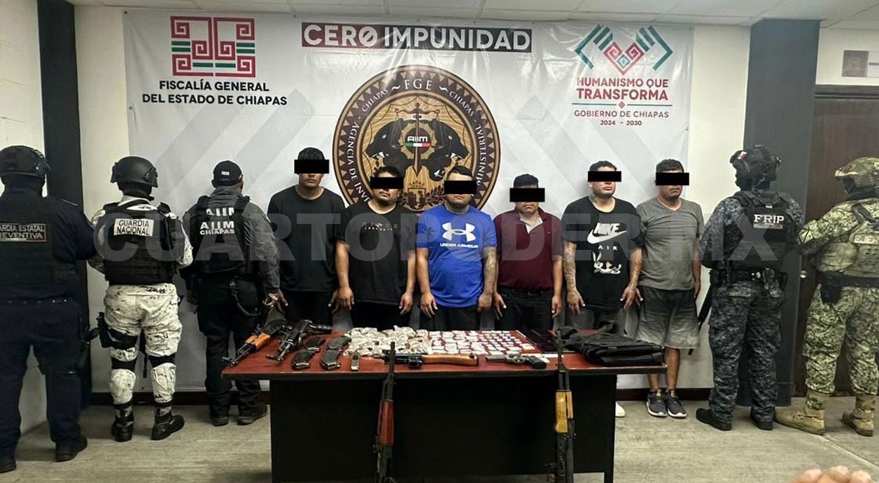 Derivado de un operativo interinstitucional encabezado por la Secretaría de Seguridad del Pueblo (SSP), a través de la Fuerza de Reacción Inmediata Pakal (FRIP) y Guardia Estatal Preventiva, en coordinación con la Agencia de Investigación e Inteligencia Ministerial (AIIM) de la Fiscalía General del Estado (FGE), Secretaría de Seguridad y Protección Ciudadana del Gobierno Federal, Ejército Mexicano, Guardia Nacional y Marina Armada de México, lograron la detención de seis personas del sexo masculino por los delitos de portación de arma de fuego de uso exclusivo de las Fuerzas Armadas y contra la salud en la carretera de cuota Tuxtla-San Cristóbal de Las Casas, a la altura del kilómetro 43.