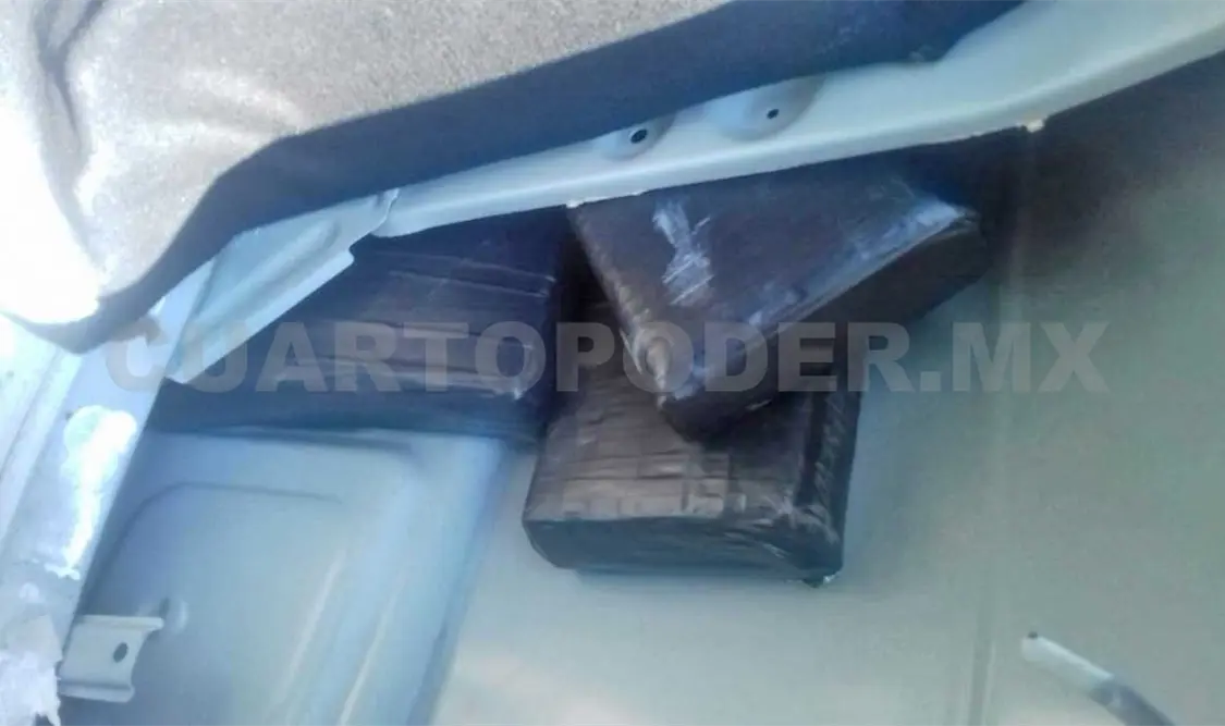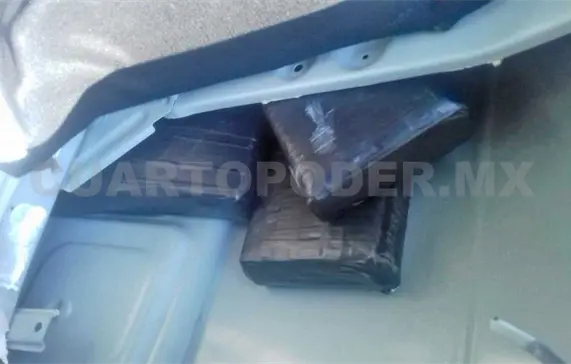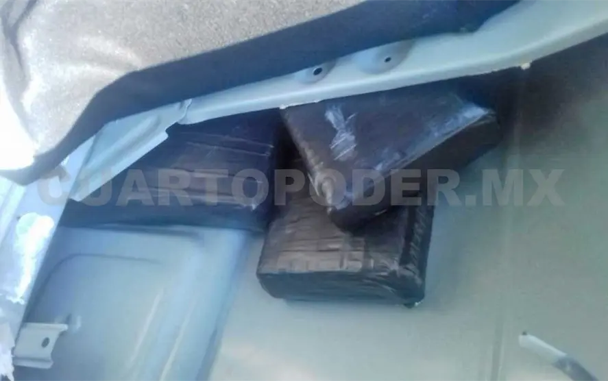 Se estableció que la unidad Nissan tipo Tsuru, modelo 2016, con placas de circulación NAM-76-73 del Estado de México, fue sometido a revisión, por lo que encontraron escondidos en la parte de la cajuela cuatro “ladrillos” de la droga antes mencionada.
