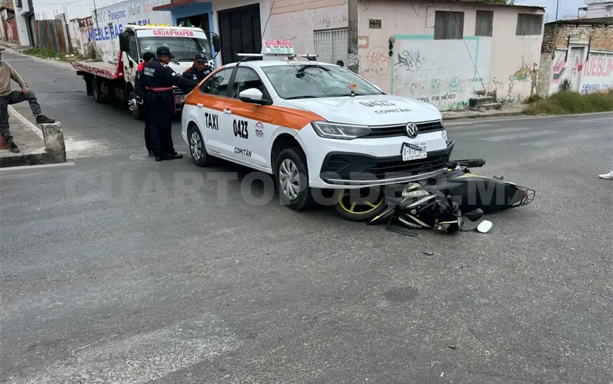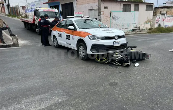 Mientras tanto, agentes de Tránsito Municipal llegaron para atender el percance, deteniendo al taxista para trasladarlo a la comandancia y esperar los resultados médicos del motorista para determinar el pago de daños.