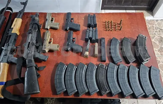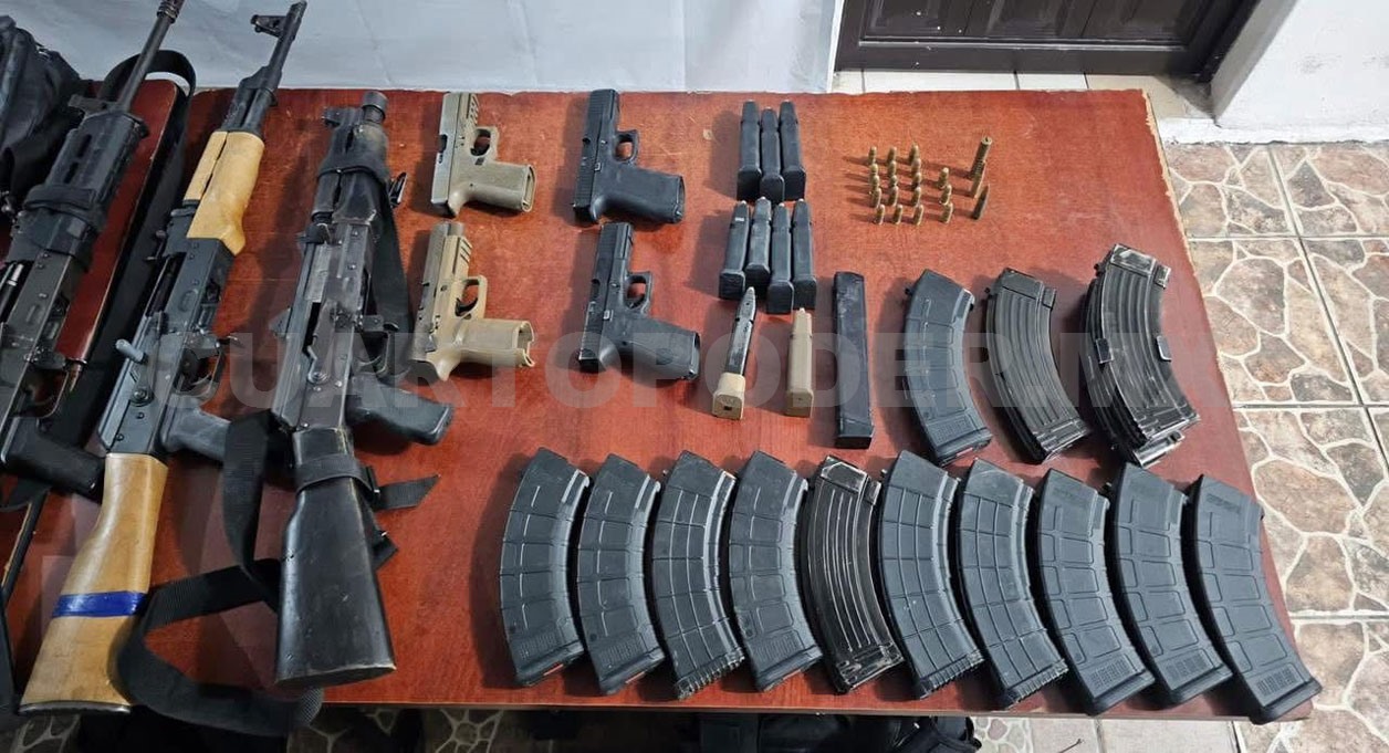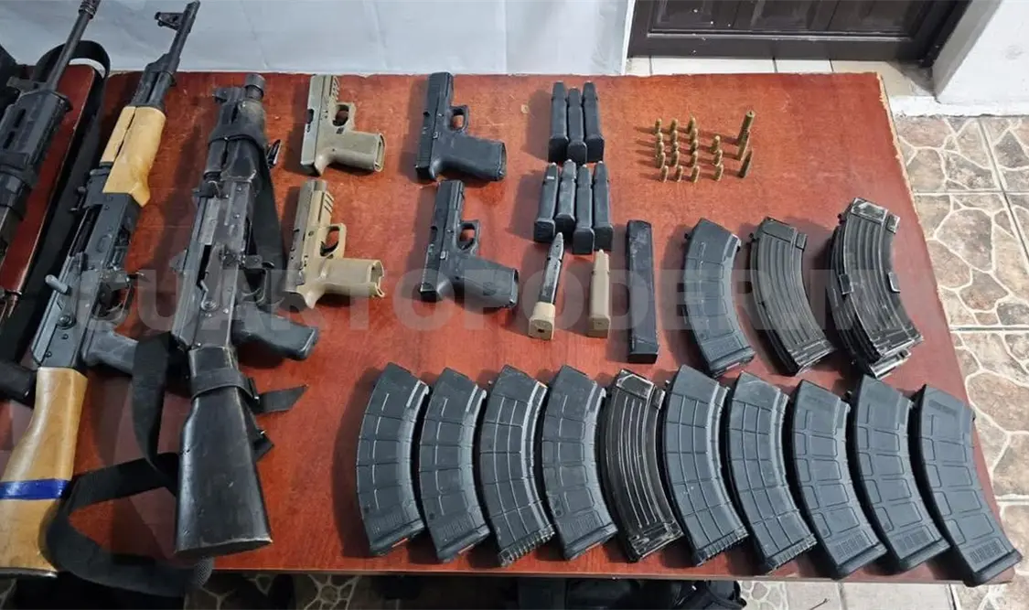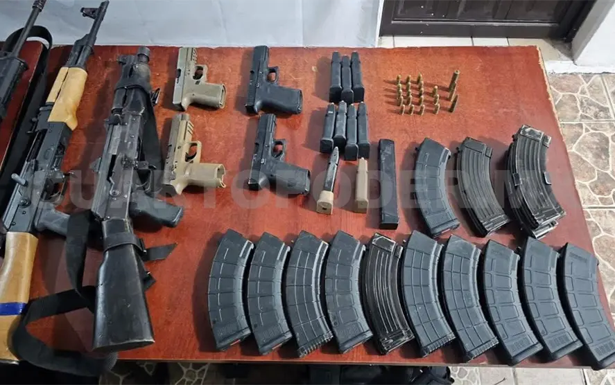 Les decomisaron tres armas largas calibre 7.62x39 mm con cargadores abastecidos y cuatro armas cortas calibre .9 mm también con cargadores abastecidos; 322 cartuchos calibre 7.62x39 mm; un chaleco balístico y siete accesorios balísticos.