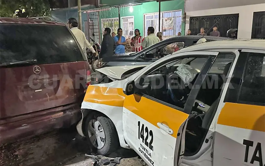 Al menos tres vehículos con daños materiales, una vivienda afectada y dos personas lesionadas, fueron el saldo de un accidente de tránsito registrado la noche del viernes en la colonia Unidad Chiapaneca de la capital Tuxtla Gutiérrez.