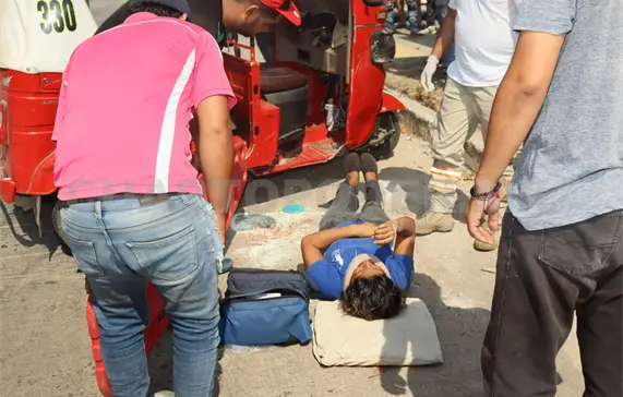 Según el testimonio del operador de la unidad del servicio público con número económico 033, circulaba con preferencia y de forma inesperada una motocicleta Vento de color amarillo se pasó la flecha roja, impactando de costado al mototaxi; por ello, la pasajera salió proyectada hacia el pavimento.