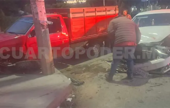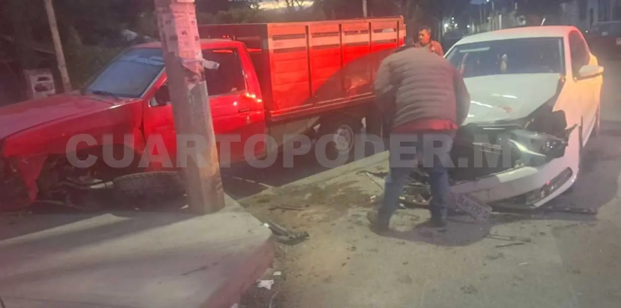 En este percance se vio involucrado un automóvil de color blanco que colisionó contra una camioneta Nissan Estaquitas, color rojo, en donde uno terminó por estrellarse contra una vivienda.