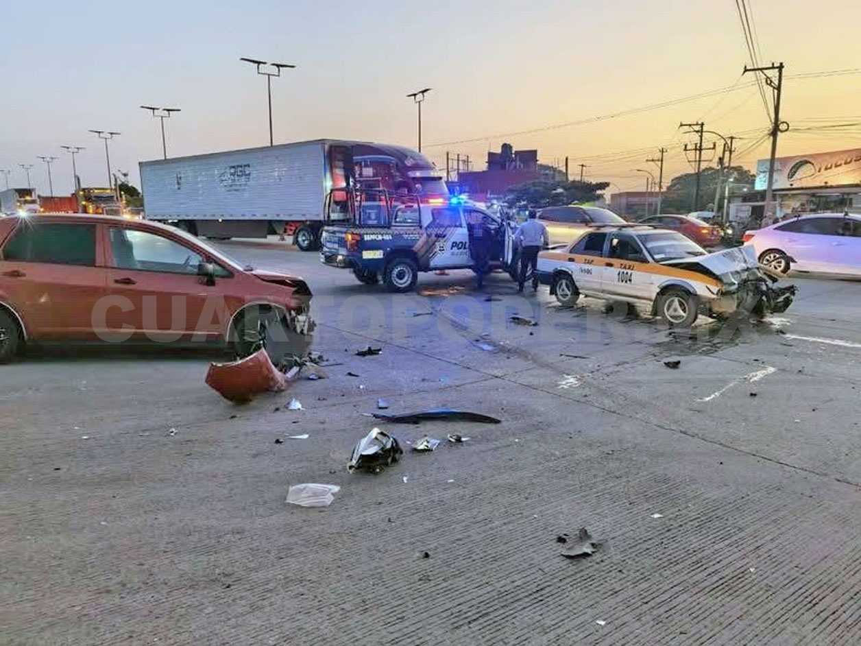 Un espectacular choque, en el que se vieron involucrados tres vehículos, entre ellos un taxi, ocurrió en el entronque del libramiento Sur y carretera al ejido Raymundo Enríquez de Tapachula, que afortunadamente solamente dejó daños materiales valuados en varios miles de pesos.
