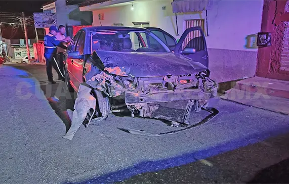 En el intento de evitar un choque frontal, maniobró y dio el volantazo, pero terminó por perder el control y colisionar contra una vivienda de color celeste, derribando la puerta y la protección de metal. Debido a la velocidad, el vehículo dio un violento giro de 180 grados.