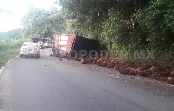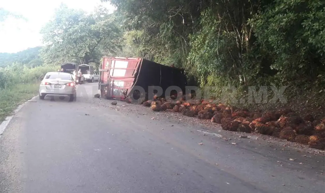 Un camión cargado con fruta de palma de aceite terminó volcado a medio carril de la cinta asfáltica, en el tramo carretero federal Palenque-Ocosingo, durante la tarde del viernes.