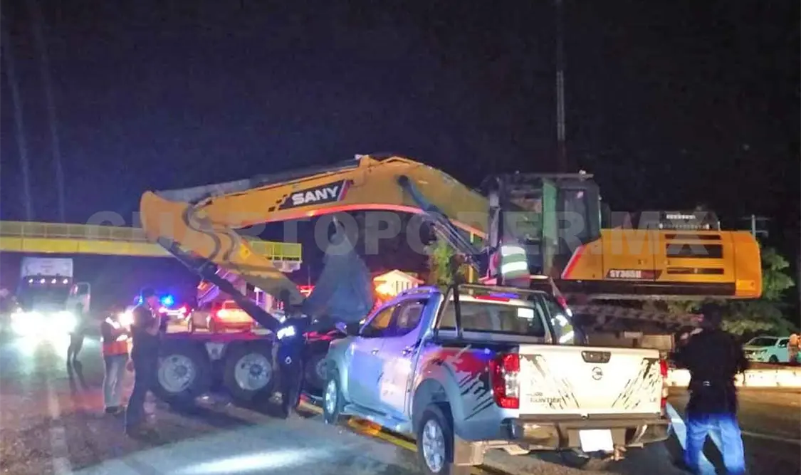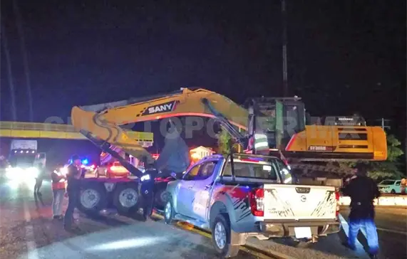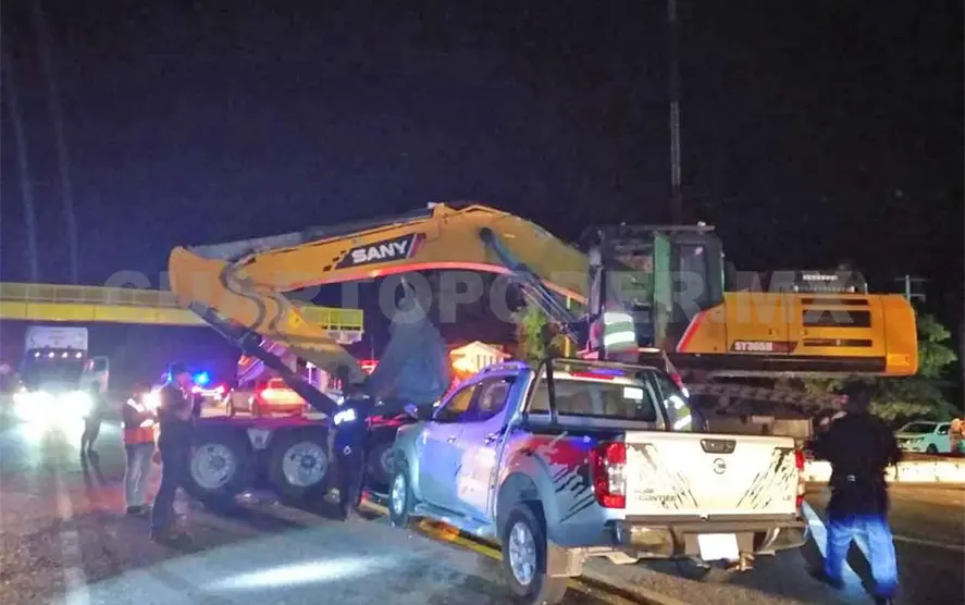 Un tráiler con remolque que transportaba maquinaria pesada y una camioneta marca Nissan tipo Frontier, color gris, tuvieron un encontronazo. A los pasajeros tuvieron que darles los primeros auxilios paramédicos de Protección Civil en el lugar, ya que presentaban lesiones de gravedad.