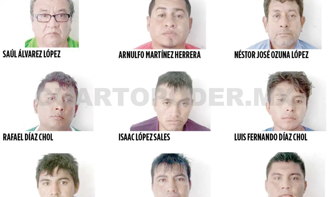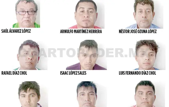 La dependencia en un comunicado precisó que los diez sujetos fueron detenidos en flagrancia, respondiendo estos a los nombres de Saúl Álvarez López, de 61 años; Arnulfo Martínez Herrera, de 29; Néstor José Ozuna López, de 52; Rafael Díaz Chol, de 36; Isaac López Sales, de 25; Luis Fernando Díaz Chol, de 20; Víctor Manuel Salas Pérez, de 21; Wilfrido Leonel Pariente Mendoza, de 18; Ovidio Arias Santos, de 38 y un menor de 17 años.