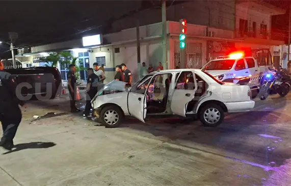 Dos lesionados y daños materiales de alta consideración dejó como saldo un fuerte choque en la esquina de la avenida Central Norte y 15ª Oriente-Poniente en el municipio de Tapachula, en donde uno de los vehículos terminó volcado.