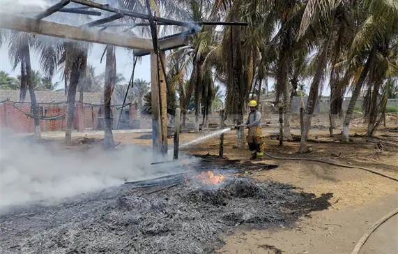 Los vecinos apoyaron a las brigadas de Protección Civil que sofocaron el fuego en la palapa construida con palma y madera, lo que propició que se propagara rápidamente.