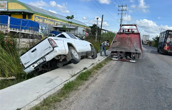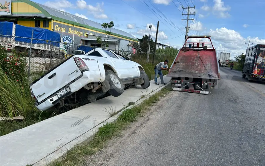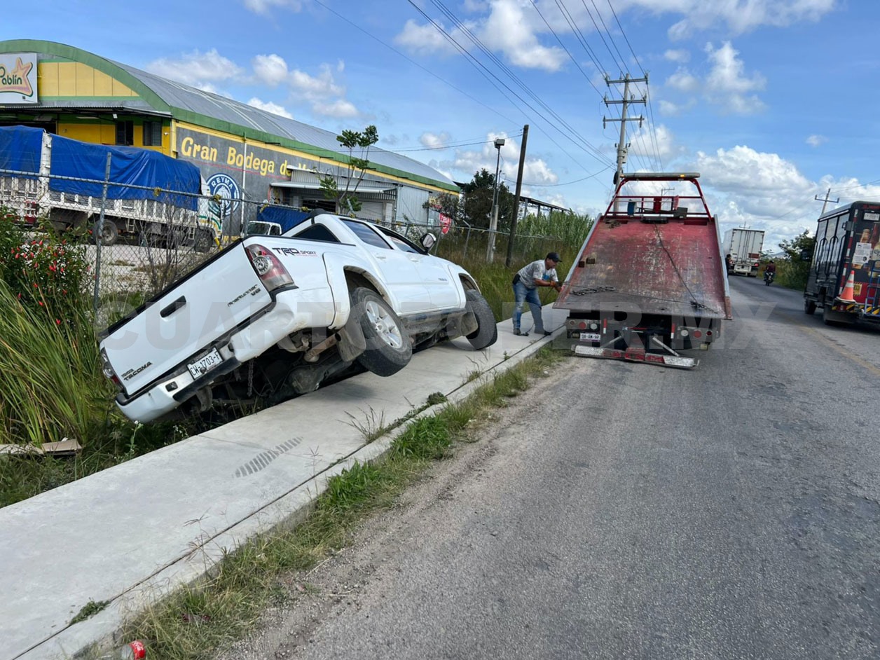 Para evitar un encontronazo frontal, el automovilista giró el volante abruptamente subiéndose a la acera peatonal. Ahí hay un desnivel en el cual terminó cayendo. La camioneta acabó con las llantas al aire y entre la maleza.
