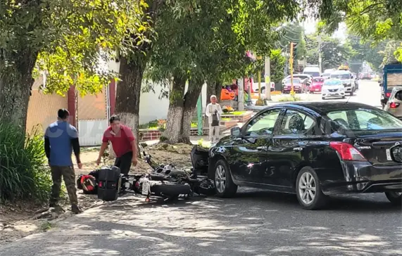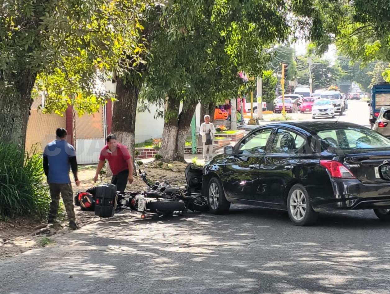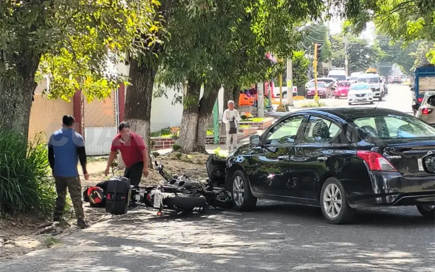 Sin embargo, fue en la maniobra que terminaron teniendo un encontronazo. El motorista se estampó en la parte lateral delantera de un Nissan Versa de color negro, que terminó con el desprendimiento de la fascia delantera.