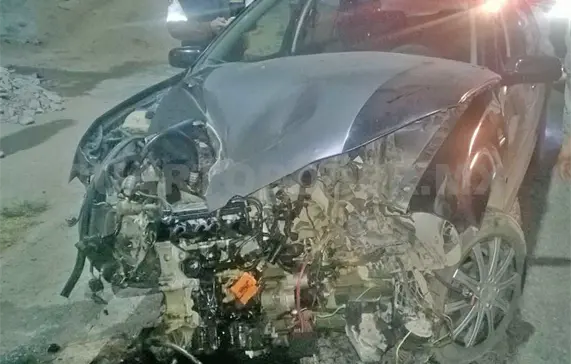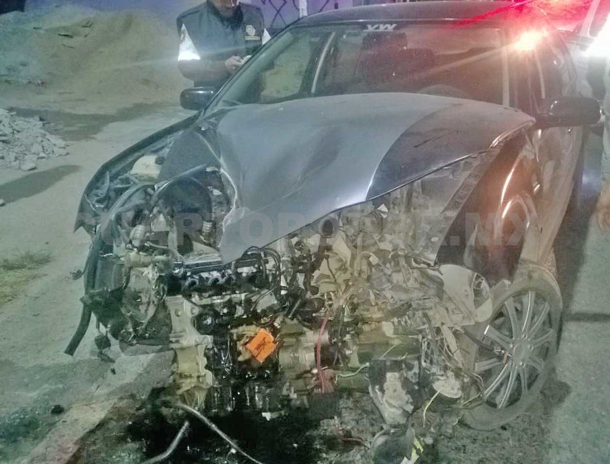 Totalmente destrozado en la parte frontal, el Jetta había chocado contra un árbol. El conductor iba, al parecer ebrio y a exceso de velocidad. Invadió carril contrario, chocó en un árbol, regresó al asfalto y colisionó contra un taxi.