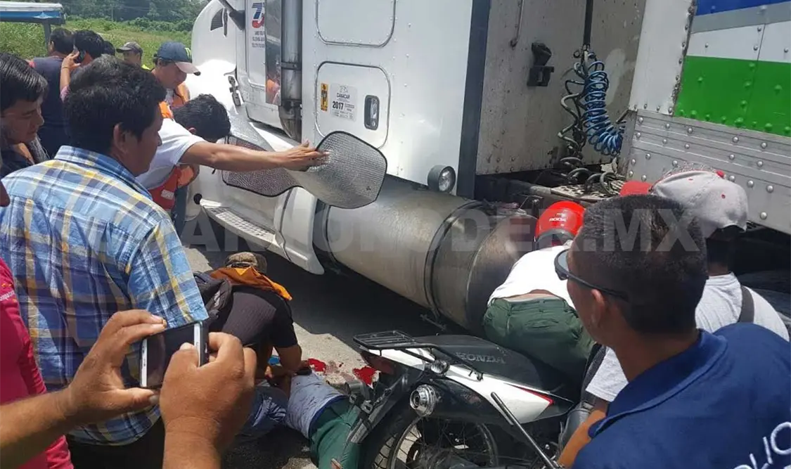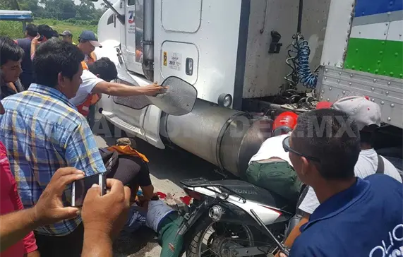 Prácticamente debajo de un tráiler quedaron tres estudiantes al impactar la motocicleta en que se desplazaban, contra la pesada unidad sobre el tramo carretero Ciudad Hidalgo-Tapachula, a la altura del puente Cuarentenaria.