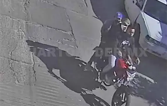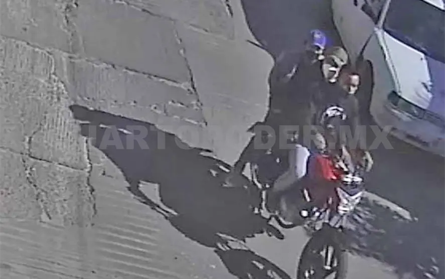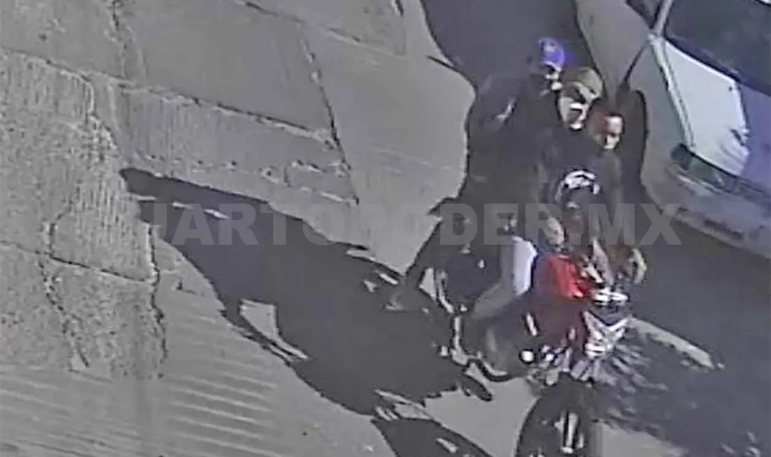 Negocios aledaños a los atracos lograron captar mediante cámaras de videovigilancia a tres hampones que circulaban en una motocicleta marca Italika, color rojo con negro; los tres se cubrían el rostro con cubrebocas y dos de ellos portaban gorras.