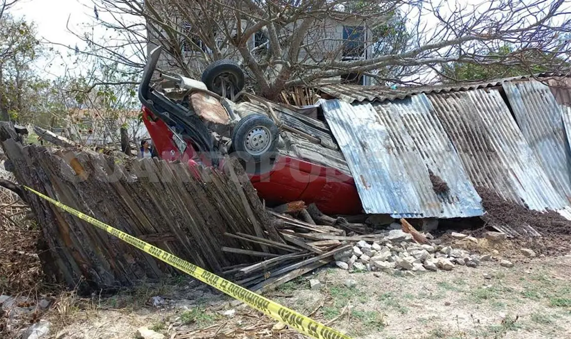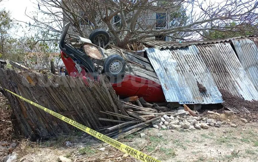 El conductor del auto compacto perdió el control y se salió de la vía, impactándose contra una vivienda de madera y techo de lámina; el carro quedó con las llantas hacia arriba y la casa destruida.