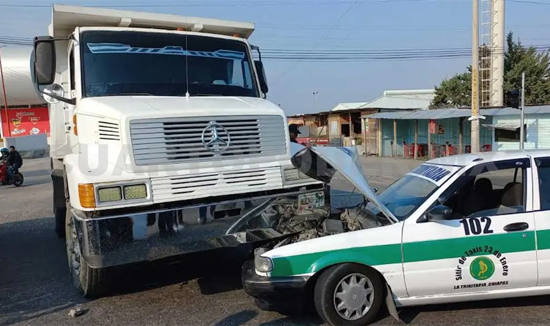 En el accidente se vieron involucrados un vehículo del servicio público en la modalidad de taxi de ruta a La Trinitaria, número económico 102, que circulaba al norte y se impactó contra un camión volteo de color blanco, de la marca Mercedes Benz, el cual se estaba incorporando a la carretera federal.
