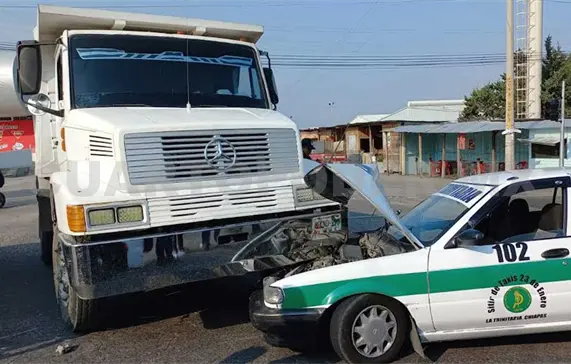 Con daños materiales por varios miles de pesos se saldo un choque entre un taxi y un camión volteo, en el cruce de la carretera federal con libramiento Sur, en Comitán. Incidente que movilizó a paramédicos y oficiales de la Guardia Nacional para atender la emergencia.