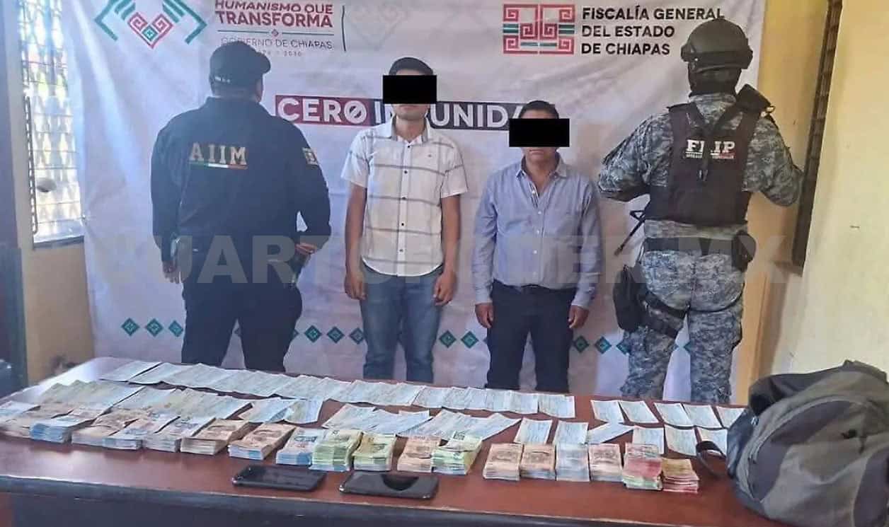 Un millón 300 mil pesos en efectivo y diversos cheques les fueron asegurados a dos sujetos, quienes terminaron arrestados en un operativo de vigilancia en el tramo carretero Huixtla-Motozintla, dentro de la demarcación del primer municipio.