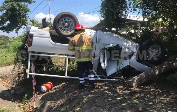 Entre los fierros retorcidos de la camioneta que manejaba quedó el cuerpo de una persona que sufrió un accidente, al salirse de la carretera, volcar y terminar impactado contra un árbol sobre el tramo Tapachula-Puerto Madero.