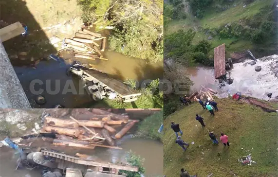 El peso de los troncos de madera provocó que el tráiler quedara aplastado, y al interior el chofer y su acompañante, quien hasta el momento permanece en calidad de desconocido.