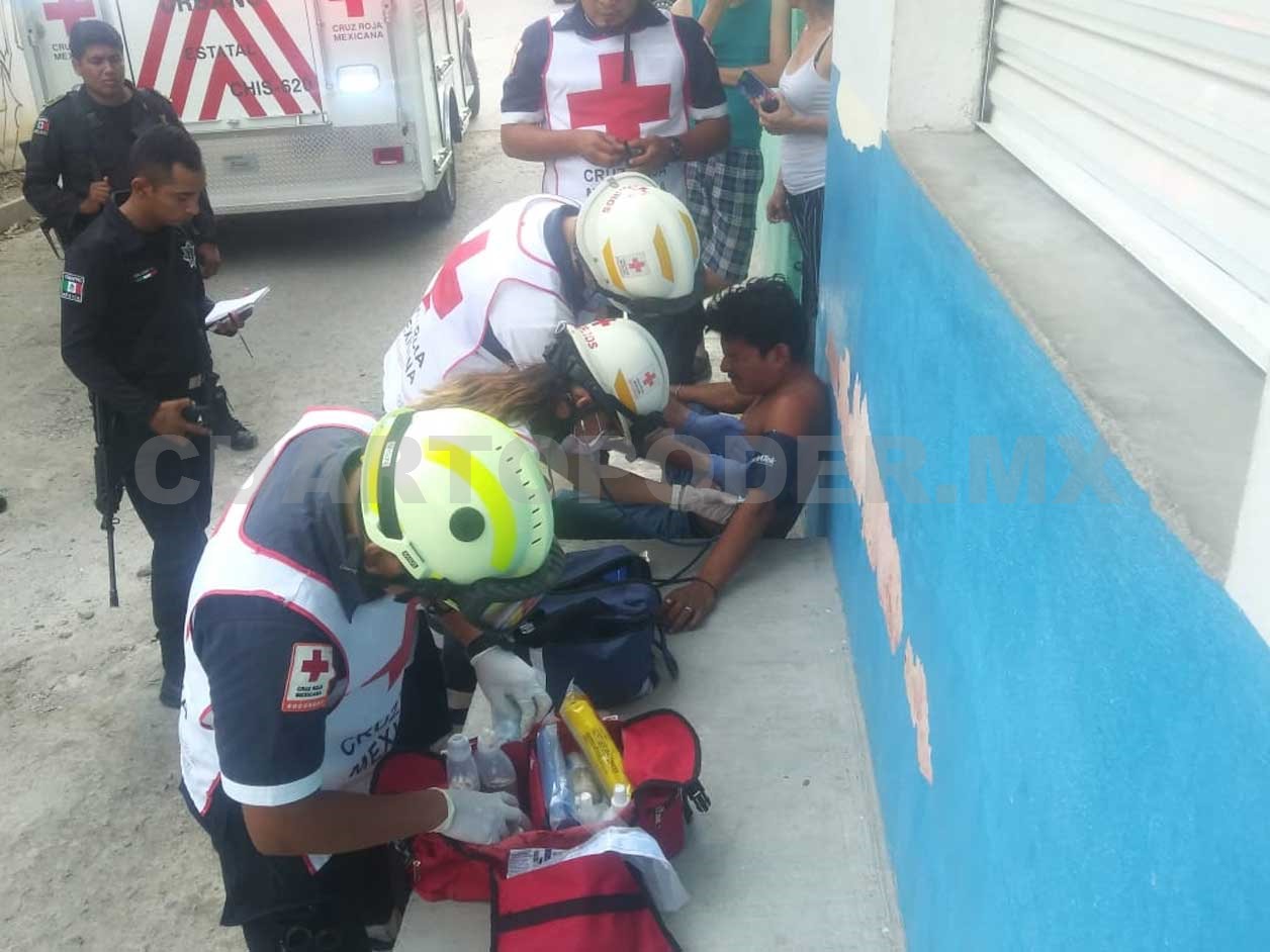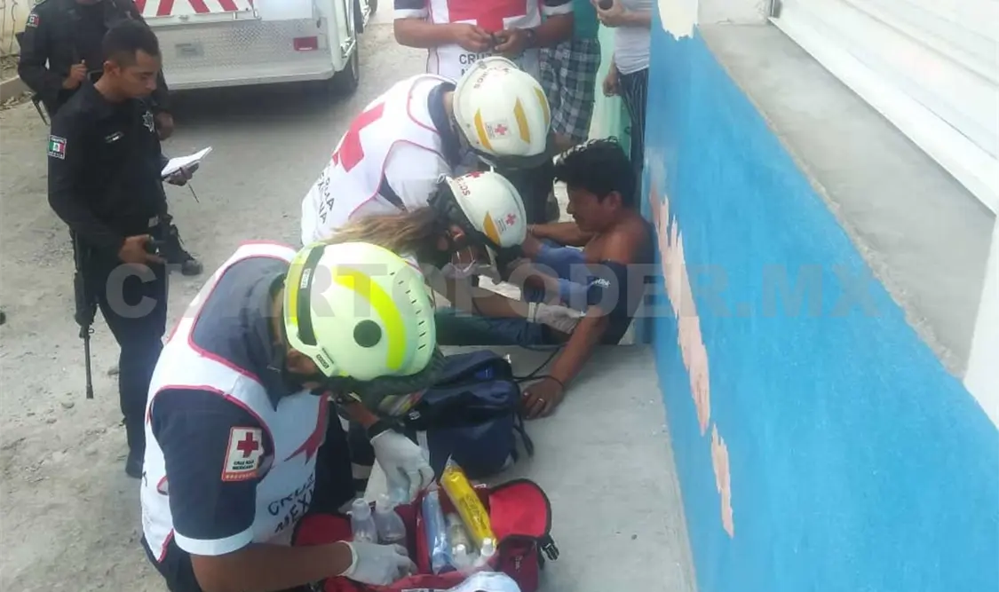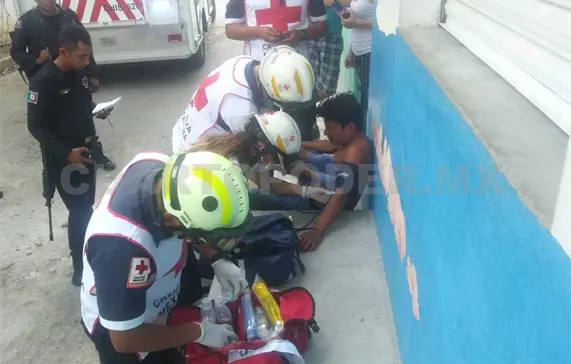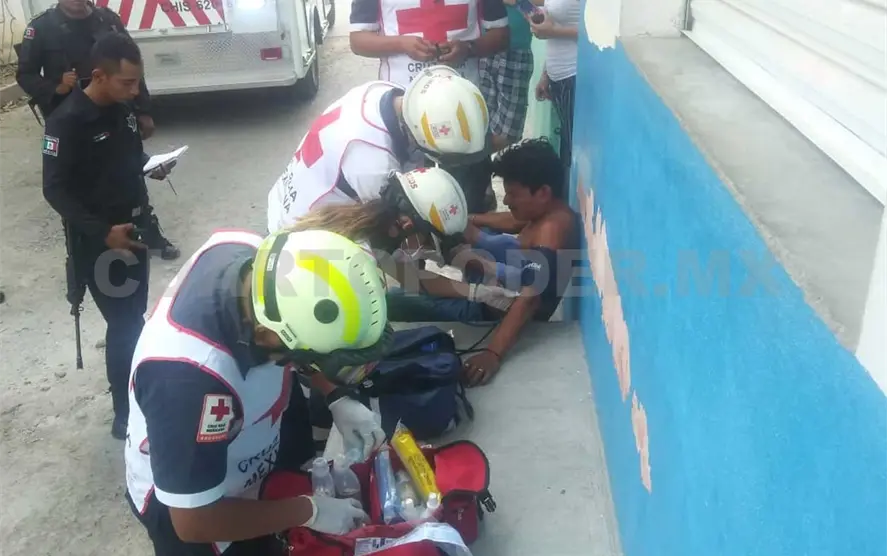 Paramédicos de la Cruz Roja Mexicana arribaron para la valoración de José Eduardo, el cual presentaba un sangrado profuso del tórax, siendo trasladado a un nosocomio para recibir la atención médica correspondiente.