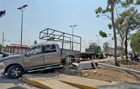 En sentido opuesto se desplazaba un tráiler con plataforma y cabina de color verde, cuyo chofer no logró frenar, así que se registró el violento impacto quedando la RAM sobre la banqueta con la góndola casi desprendida.