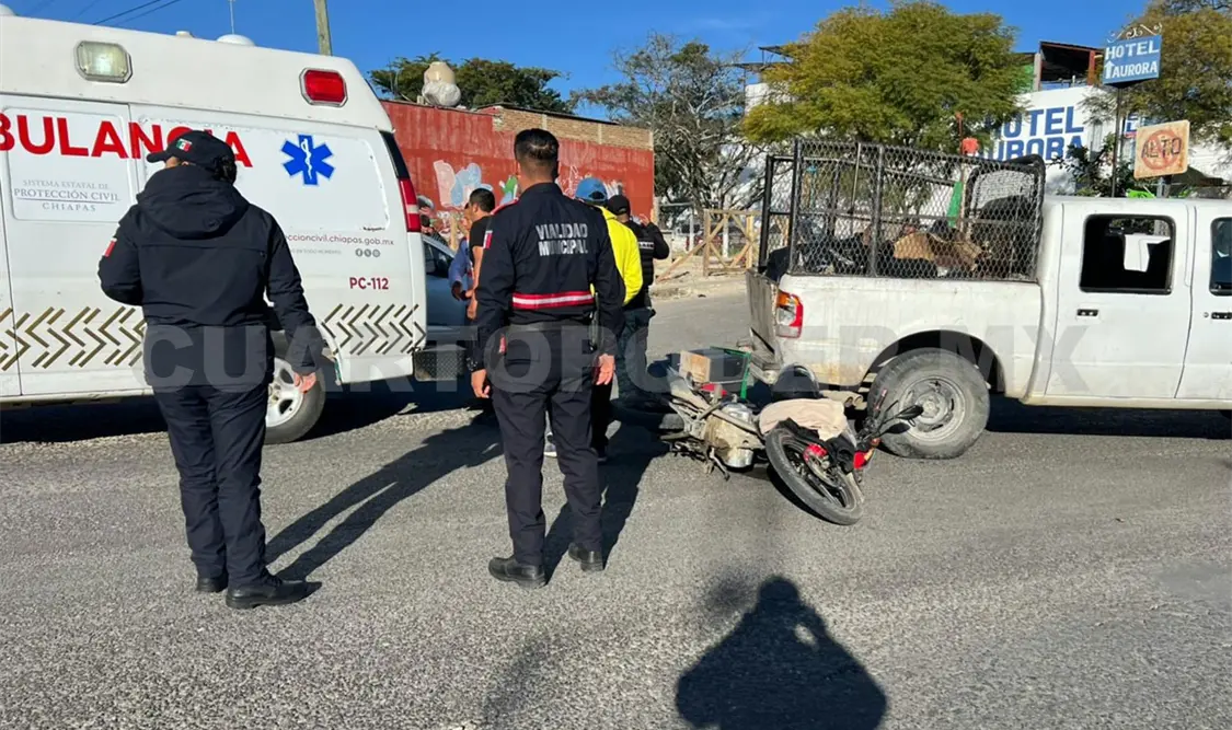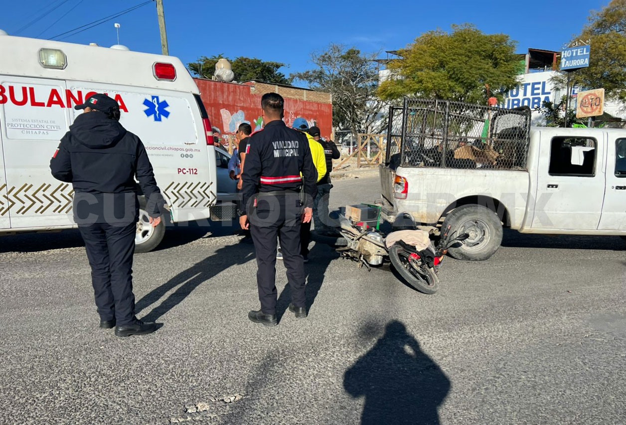 En la parte trasera de una camioneta pick up fue donde se estampó una pareja de motociclistas. El conductor de la primera unidad trató de ganarle el paso a la moto en una avenida al sur de la ciudad de Comitán de Domínguez.