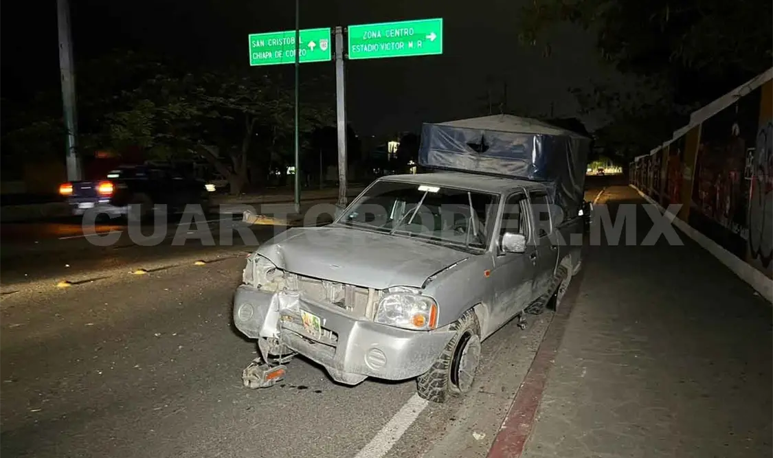 Agentes de Tránsito y Vialidad Municipal informaron que una camioneta de la marca Nissan, doble cabina, con placas de circulación del estado de Chiapas, realizó una mala maniobra y esto provocó que el conductor perdiera el control y se estrellara contra un poste de alumbrado público.