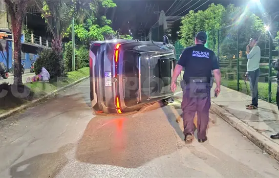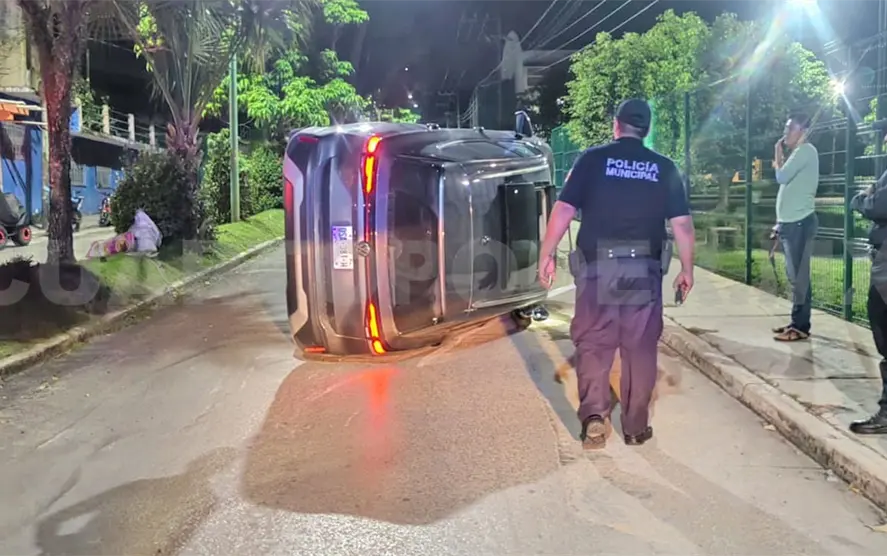 Un accidente vehicular se registró durante la medianoche del viernes y los primeros minutos del sábado en el municipio de Palenque, luego de que el conductor de una camioneta Volkswagen Tiguan de color gris perdiera el control y volcara. Esto luego de que la unidad subiera al camellón central del periférico Norte, a la altura de la entrada principal de la Unidad Deportiva.