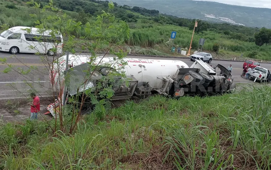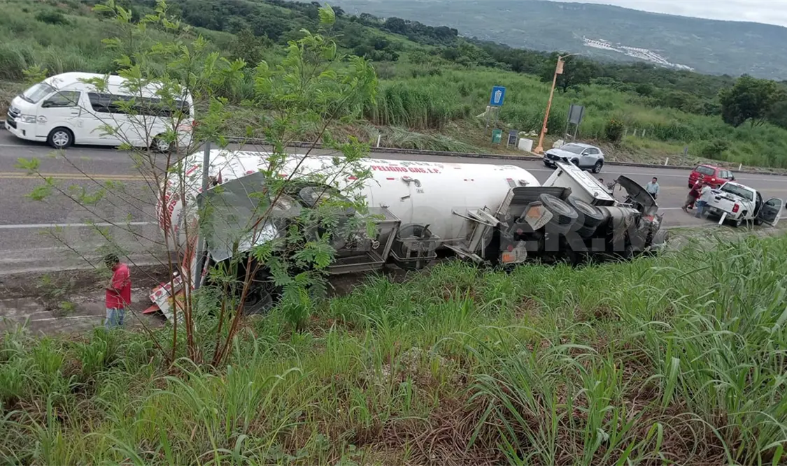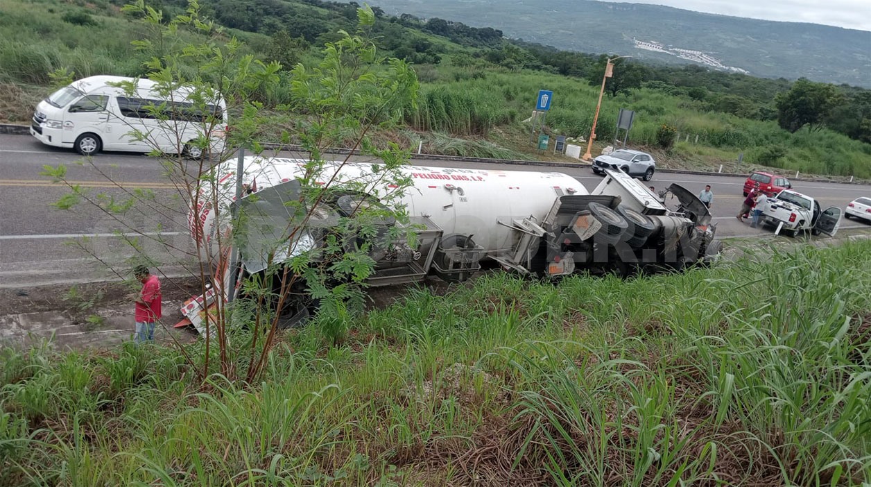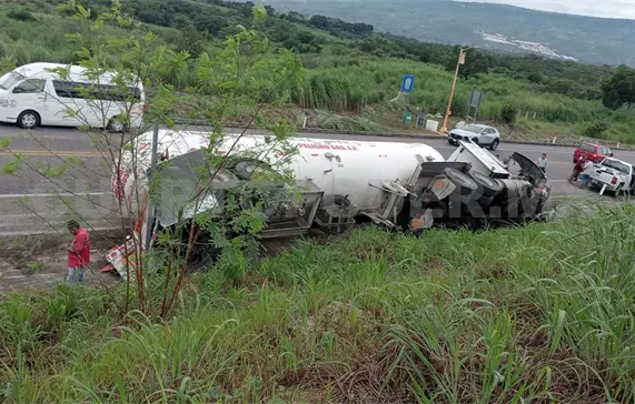 A un costado de la carpeta asfáltica yacía una unidad tipo pipa, cargada con combustible y volcada justo sobre la cuneta.