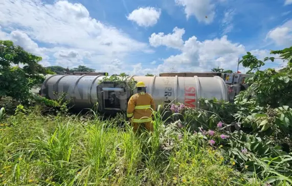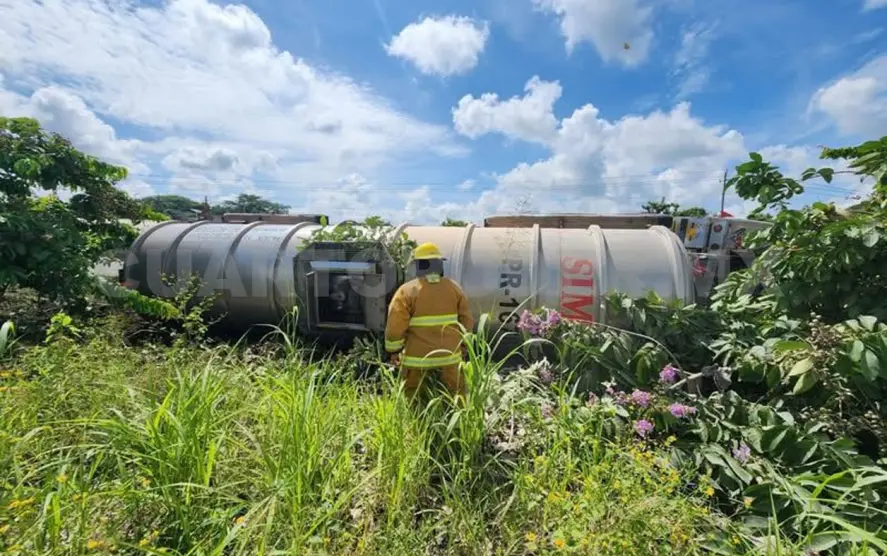 Fue a la altura del cantón Leoncillos en donde ocurrió el percance, cuando el chofer de la unidad con doble cisterna perdió el control del volante, aparentemente por una falla mecánica en la dirección, saliéndose del camino y volcando.