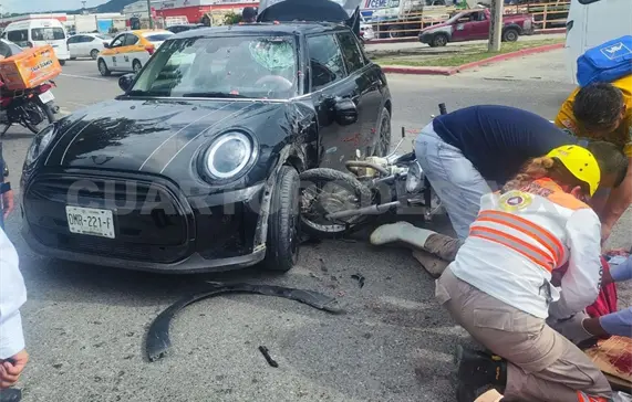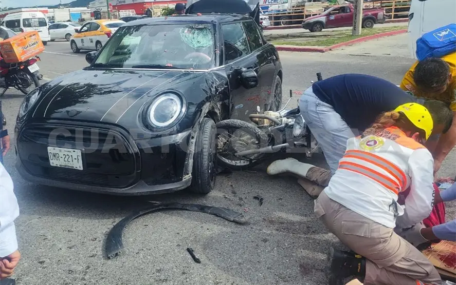 Les informaron que un joven se desplazaba a bordo de una motocicleta cuando de pronto un automóvil de lujo Mini Cooper, le quiso ganar el paso.
