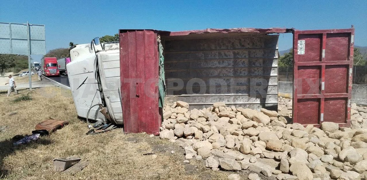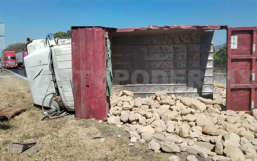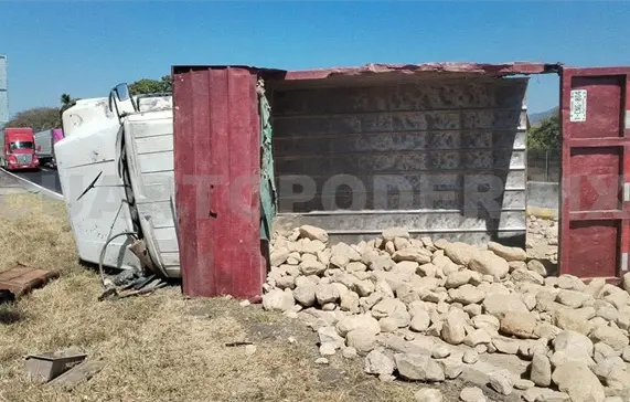 Volcado sobre uno de sus costados fue como terminó un camión de volteo que transportaba material pétreo en el tramo carretero Tonalá-Puerto Arista, a la altura del retorno, generando movilización de cuerpos de apoyo y afectaciones parciales a la circulación.